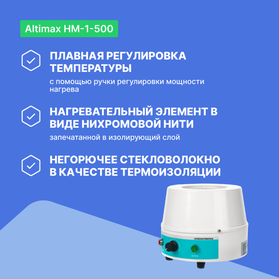 Лабораторный колбонагреватель Altimax HM-1-500 — это надежное устройство, обеспечивающее равномерный нагрев жидкостей в круглодонных колбах объемом 500 мл, без риска перегрева.