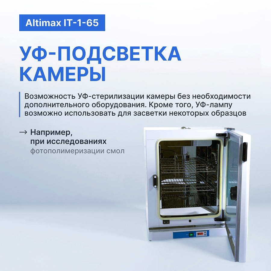 Термостат Altimax IT-1-65 может быть эффективно использован в биологических и биохимических исследованиях, а также для анализа воды и в других областях применения. Наличие ультрафиолетовой лампы позволяет проводить дезинфекцию камеры и образцов, а также осуществлять облучение исследуемых объектов, таких как фотополимеры и смолы.