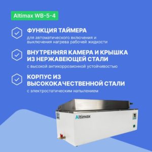 Водяная баня Altimax WB-3-5 предназначена для нагрева различных ёмкостей (колб, пробирок, стаканов и т. д.) в диапазоне температур от комнатной до 100 °C. Это устройство подходит для сушки, концентрирования, перегонки химических веществ, проведения и подготовки химических реакций, термостатирования и инкубации. Водяные бани Altimax используются в медицине, биологии, биохимии, физической химии, химии, для анализа качества продукции и сырья, а также в других областях, где требуется термостатирование и нагрев в узком температурном диапазоне. Благодаря цифровому ПИД-регулятору, защите панели управления от случайного попадания жидкости и высокой точности нагрева, эти бани являются надёжным и эффективным инструментом для лабораторий и исследований. В бане предусмотрено 4 рабочих мест.