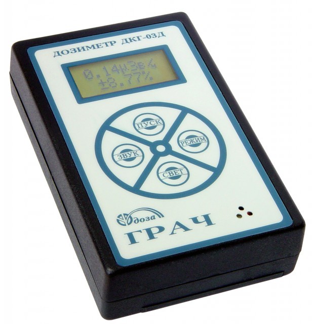 Компактный высокочувствительный дозиметр ДКГ-03Д «Грач» предназначен для оперативной оценки радиационного фона, измерения интенсивности гамма- и рентгеновского излучения. Прибор оповещает о загрязнении звуковым сигналом, частота которого пропорциональна мощности дозы. Дозиметр ДКГ-03Д «Грач» производится в России и внесён в государственный реестр средств измерений РФ под номером 19399-00 (свидетельство). Изготавливается по ТУ 4362-048-31867313-2005