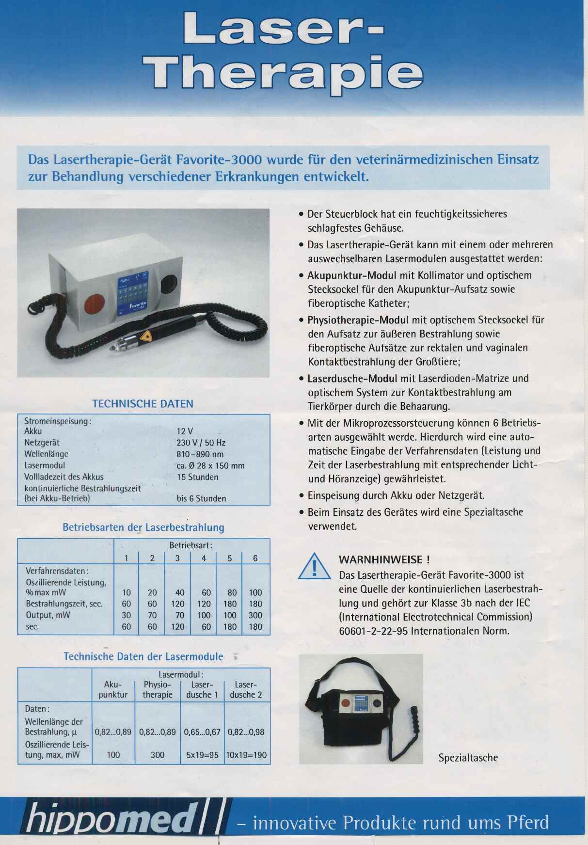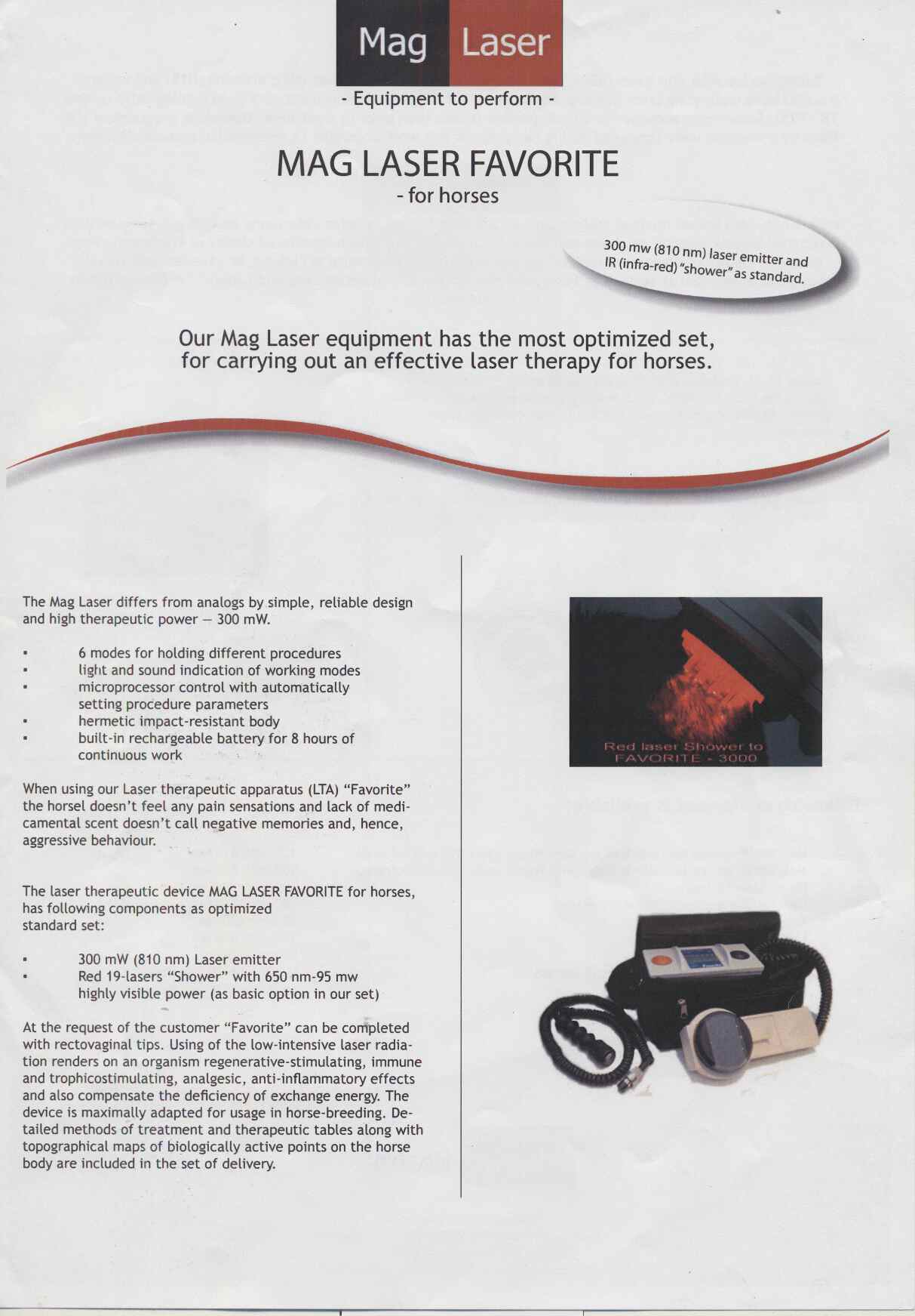 Аппарат специально разработан для лечения заболеваний крупных лошадей. Он снабжен оптическими насадками, рассчитанными не на человека-пациента, а на животное. Ударопрочный корпус имеет пылебрызгозащитное исполнение, аппарат используется помещенным в наплечной сумке. Фаворит в своей экспортной модификации FAVORIT -3000 прошел европейскую сертификацию, и сейчас успешно работает на всех континентах, кроме Антарктиды. За рубежом эти аппараты более популярны, чем в России. Это не удивительно, так как в маленькой Финляндии число лошадей больше чем у нас в стране.
