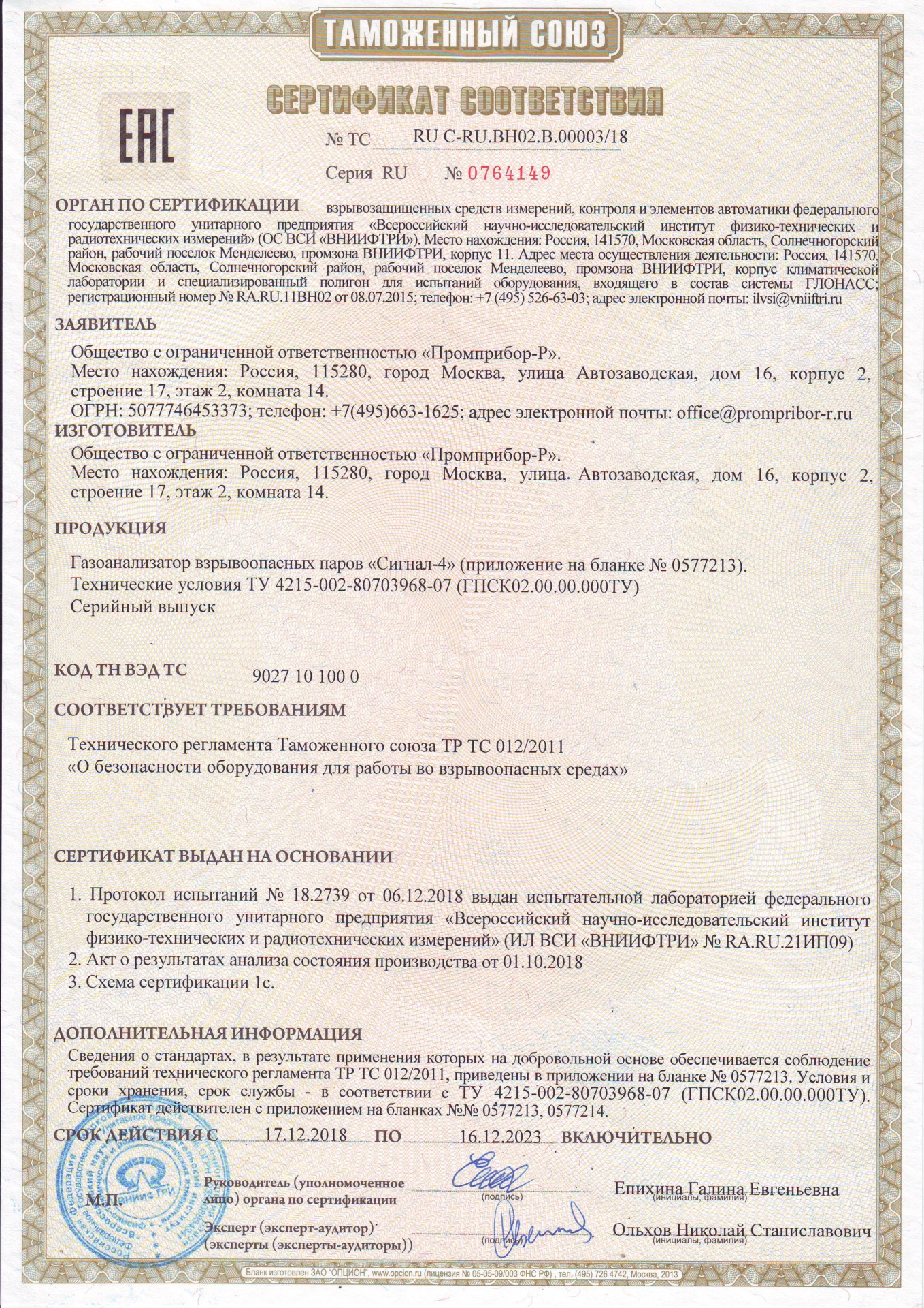 Сертификат соответствия № ТС RU C-RU.BH02.B.00003/18 срок действия до 16.12.2023