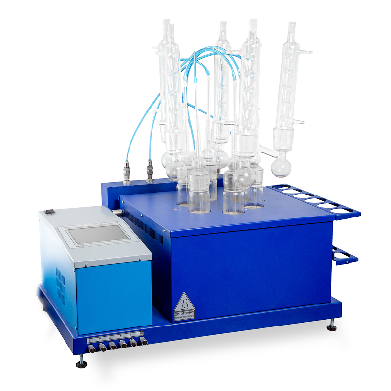 • В нагревательный блок можно установить до шести испытательных сосудов и подключить их к штуцерам, с помощью которых в реакторы подаётся воздух. Встроенный нагреватель бани обеспечивает точность поддерживания температуры: ±0,5 °С в диапазоне от 40 до 180 °С и ±1 °С - в диапазоне от 180 до 350 °С.