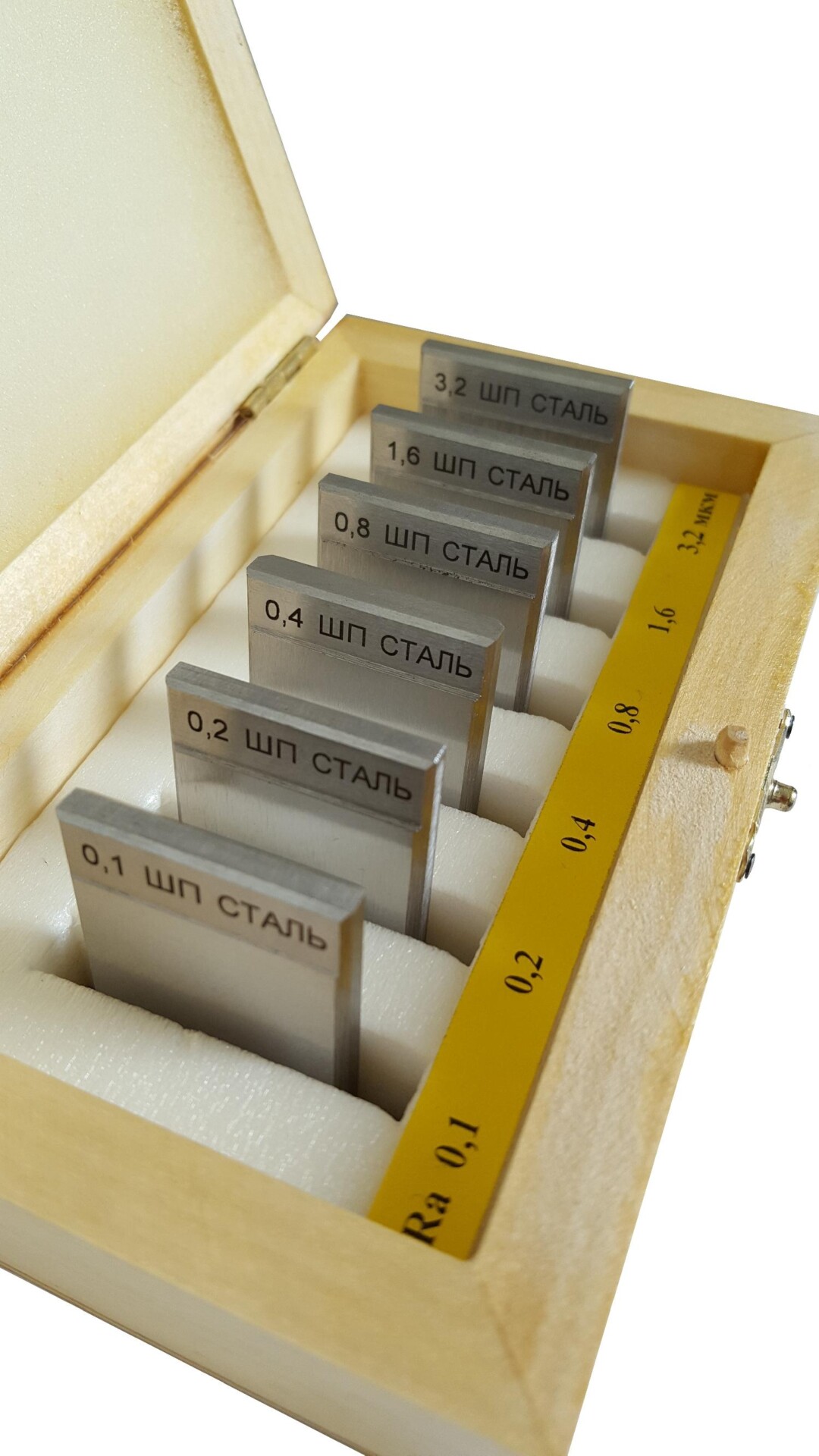 Образцы изготавливаются с различными номинальными значениями параметра шероховатости Ra, выбранными из ряда номинальных значений, допускается дополнительно оценивать поверхность образцов параметрами шероховатости Rz, Rmax, Sm, S и др., значения которых не нормируются и приводятся как справочные по результатам измерений. Также можно заказать комплект из 6 шт, состоящий не из образцов с различными номинальными значениями параметра шероховатости Ra, а комплект только с одним или двумя номинальными значениями параметра шероховатости Ra, например: 0,1; 0,2; 0,3 и далее по выбору заказчика.