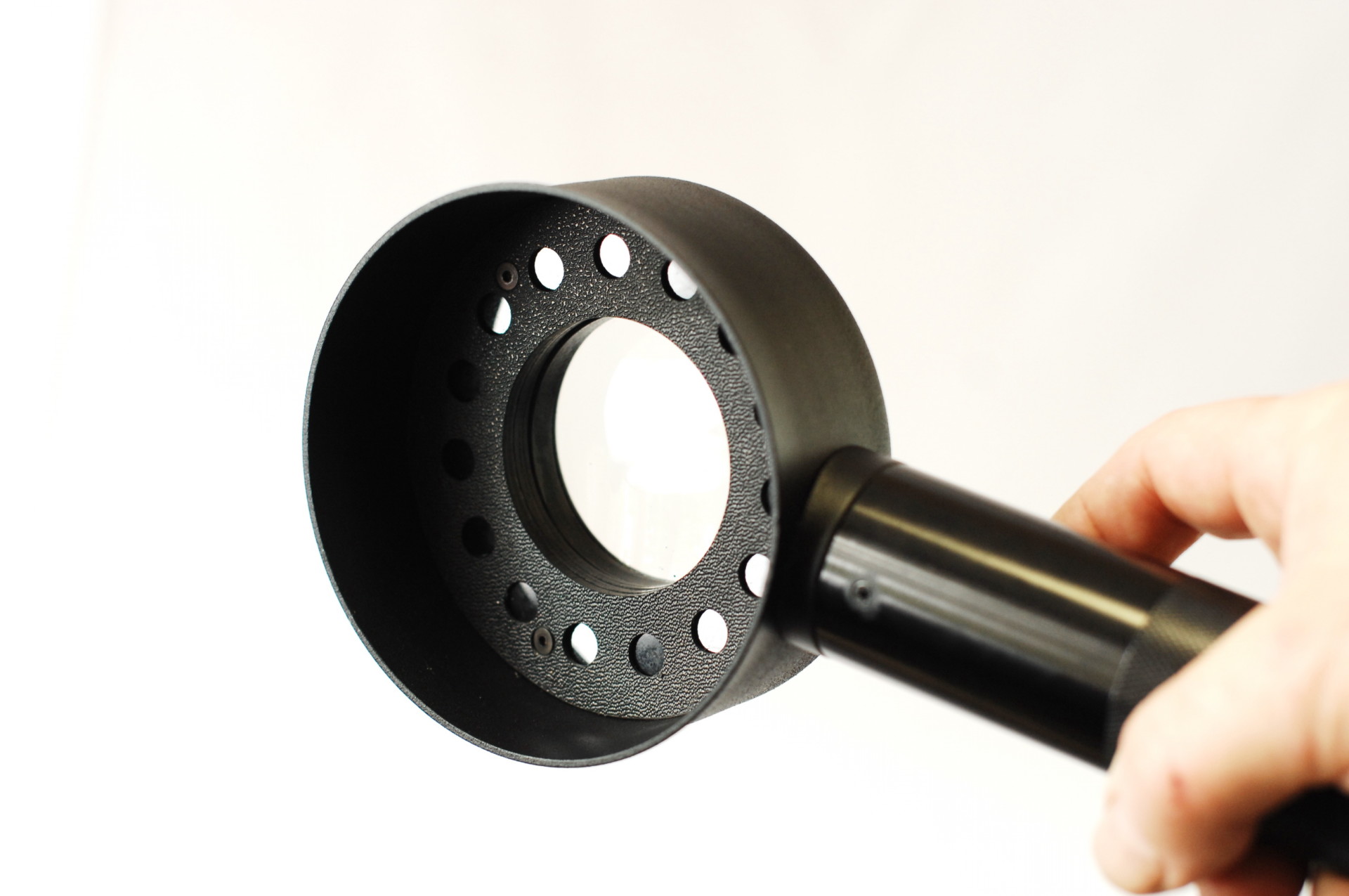 Наличие съемной тканевой бленды , как и сама конструкция осветителя, затеняет объект исследования от постороннего света.  Такая конструкция снижает освещенность в поле наблюдения и повышает контраст, а значит — и обнаружительную способность прибора.  Увеличительная стеклянная линза поглощает ультрафиолет и надежно защищает глаза исследователя, эксперта, или лаборанта от отраженного или рассеянного УФ излучения.