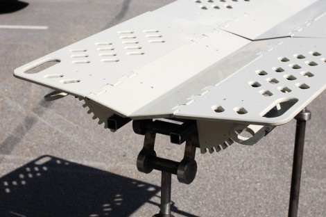 • Рабочая поверхность стола состоит из неподвижной центральной части и четырех подвижных секций с отверстиями для фиксации конечностей. Каждая секция регулируется отдельно, угол фиксируется с помощью специальных направляющих.