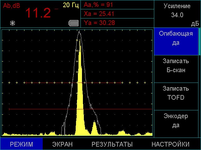 Режим огибающей для надежной фиксации максимума сигнала, предназначенный для оценки формы дефекта при ультразвуковом контроле сварных швов и основного металла.