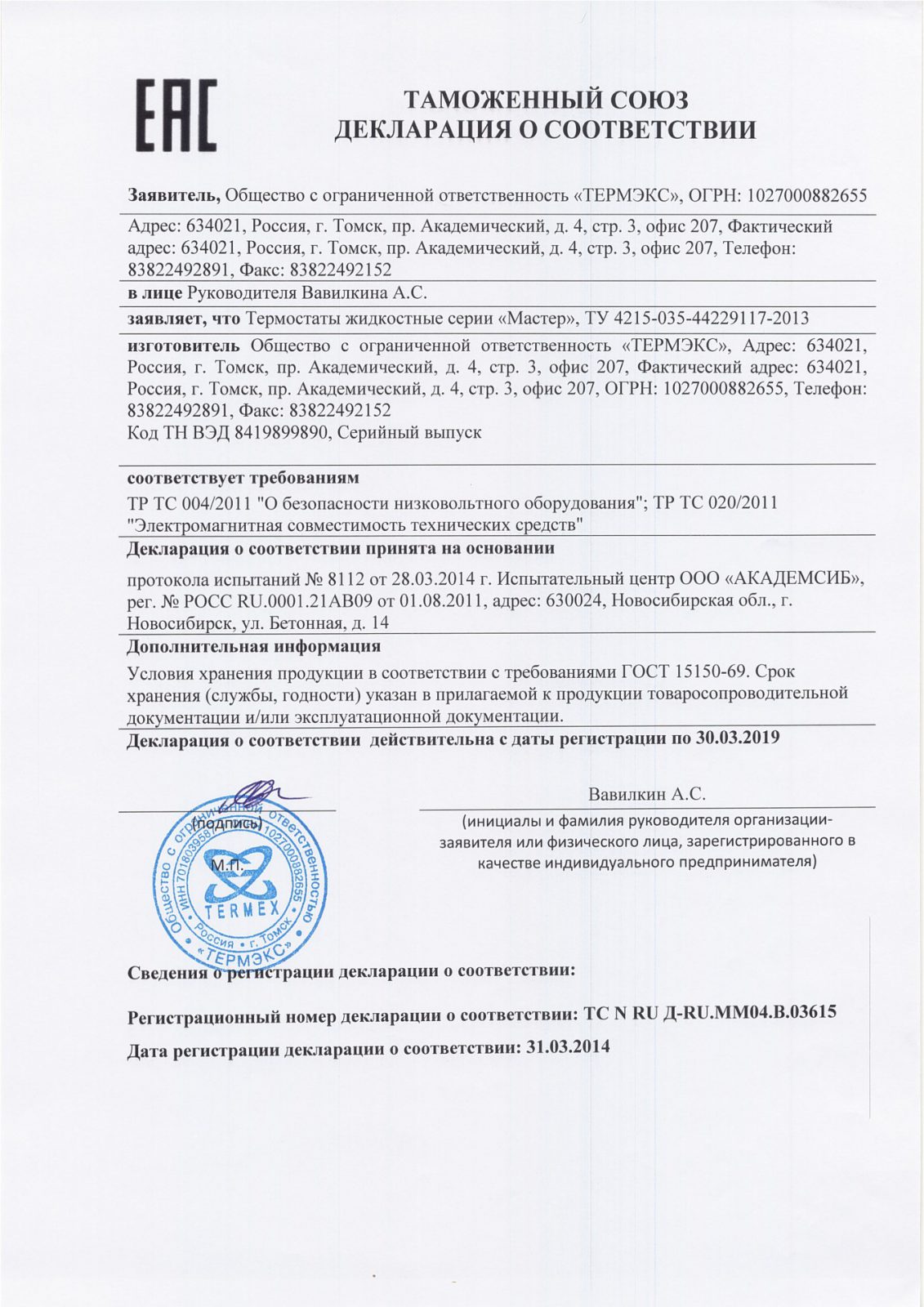 Термостаты жидкостные серии «Мастер». Декларация о соответствии